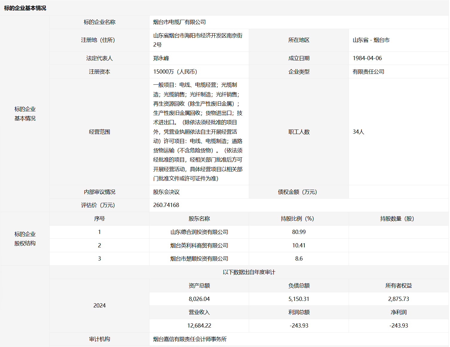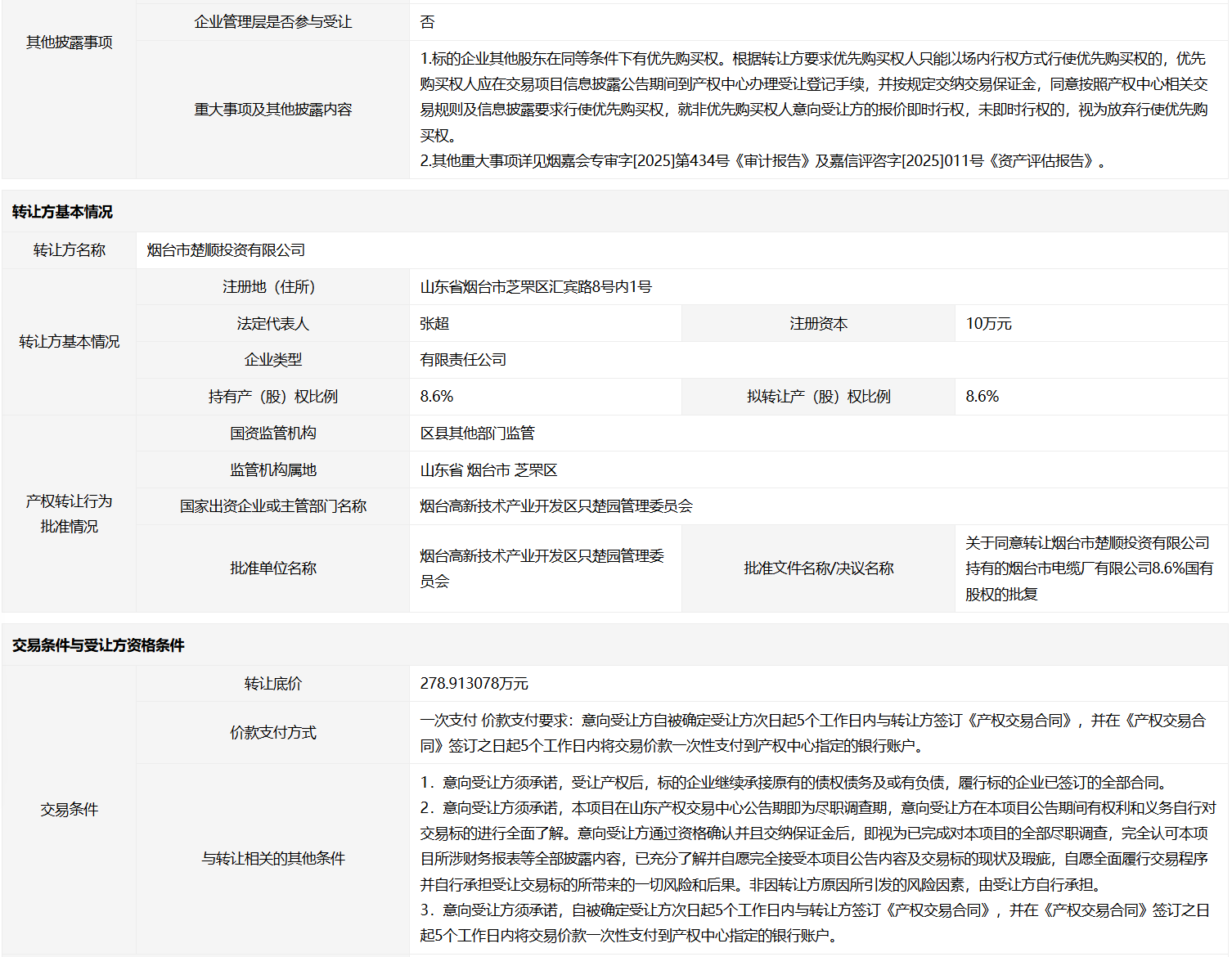 煙臺(tái)市電纜廠有限公司8.6%國有股權(quán)