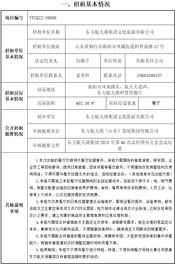 東方航天港科普館餐廳租賃運營服務項目